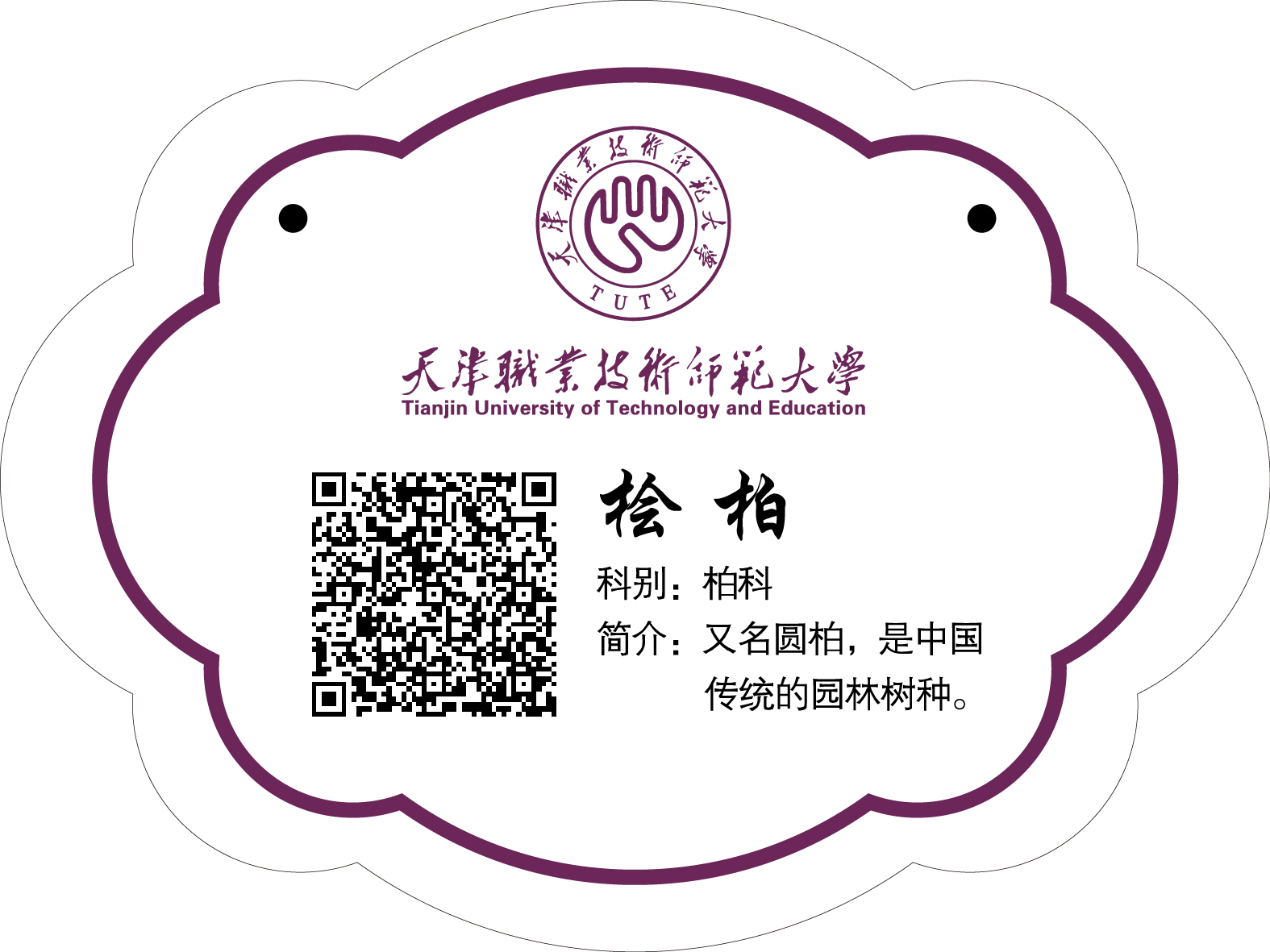 动物铭牌由少20cm,下14cm,薄度为0.5cm的铝板造做而成,轮廓印有动物称呼、科别、简介和黉舍校徽、校实,并镶嵌了动物的两维码,师死应用脚机停止扫描后会呈现详实的动物先容,简单领会动物学问。挂牌的树种重